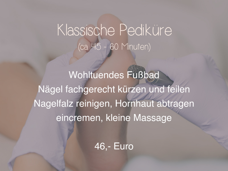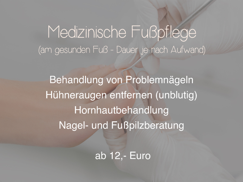 Wir gehen und stehen täglich auf ihnen: Unsere Füße tragen uns jeden Tag mehrere tausend Schritte durch die Weltgeschichte. Gerade deshalb sollten Sie sich sorgfältig um sie kümmern. In meiner Fußpflegepraxis können Sie Ihren Füßen eine wohlverdiente Auszeit gönnen. Mit modernen Techniken führe ich die medizinische und kosmetische Fußpflege durch, damit Sie noch viele weitere unbeschwerte Schritte auf ihnen gehen können.